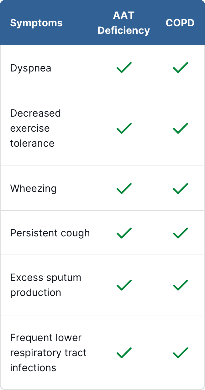 Alpha1-antitrypsin (AAT) deficiency shares an almost identical clinical presentation of signs and symptoms with COPD (which includes emphysema, asthma, and chronic bronchitis)2-4: